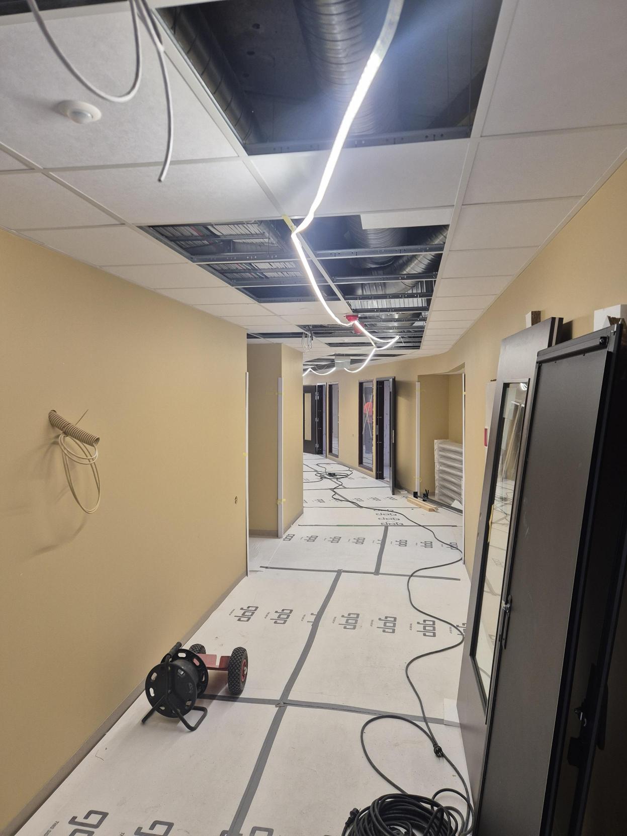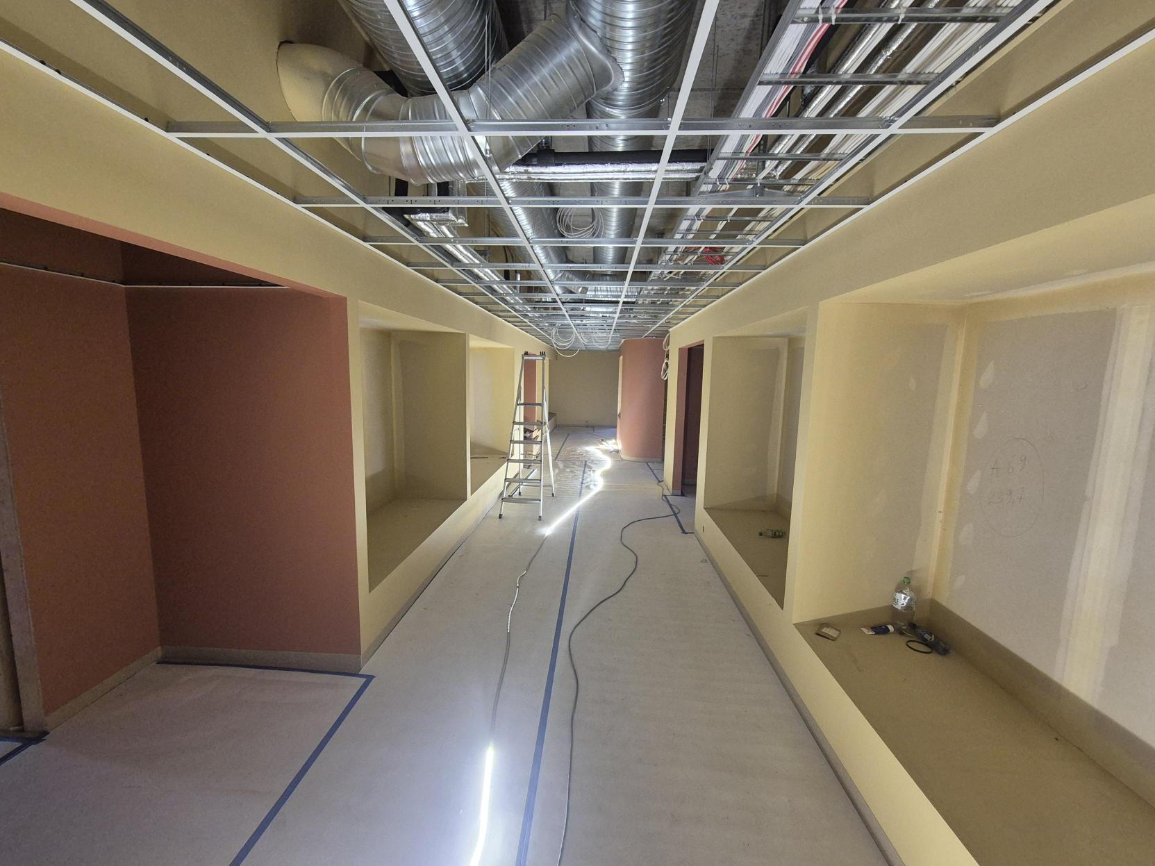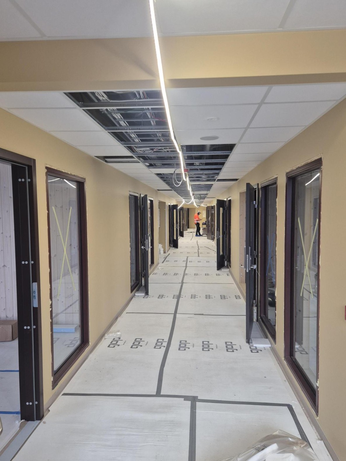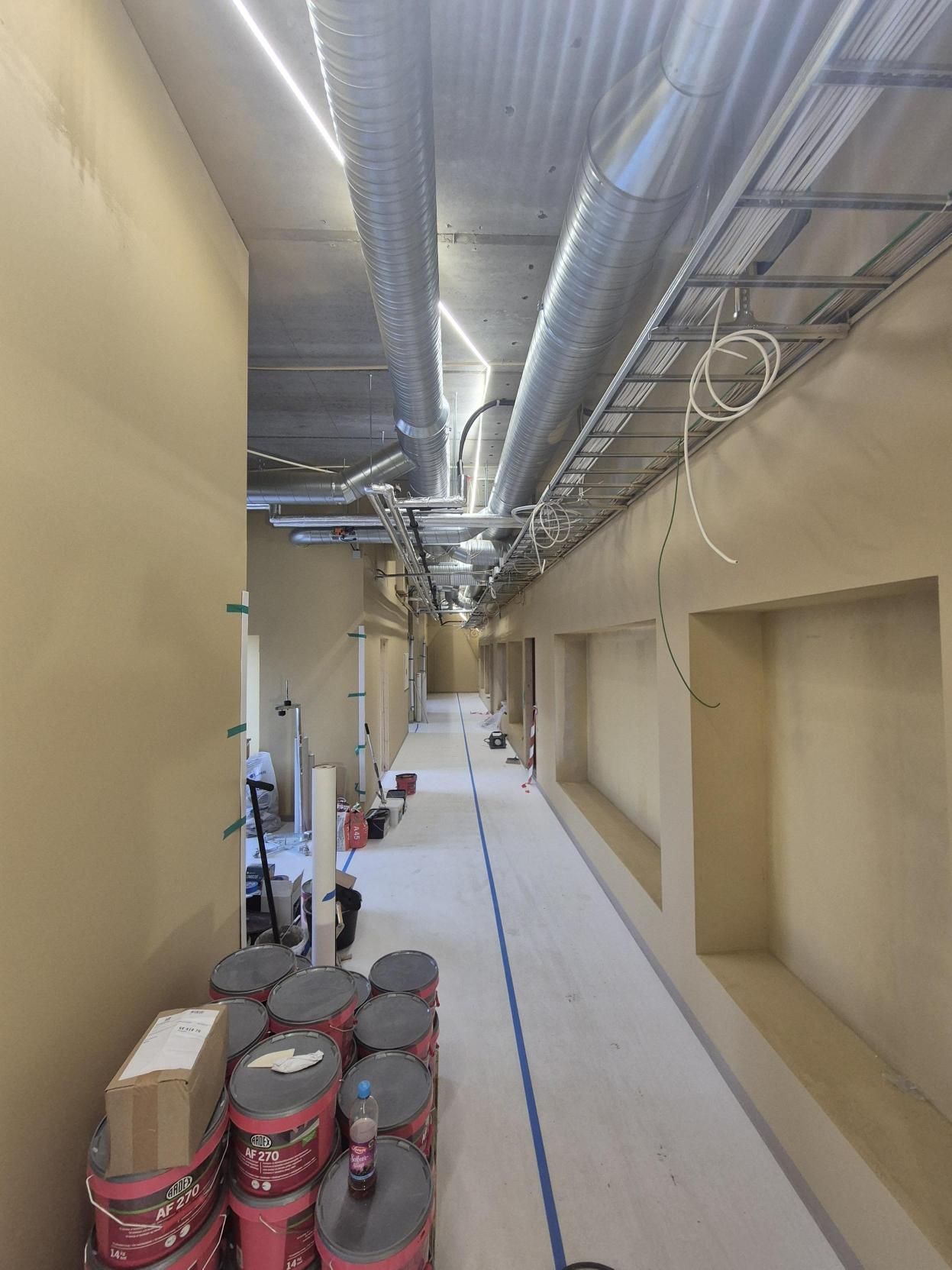 Innvendig arbeid på Stange skole har gjort store fremskritt den siste tiden. Betonggulvene er slipt, veggene på klasserom er panelert, og vinduer og dører er på plass. Himlingsmontasjen gir et ryddig takmiljø, mens gulvbelegg og malerarbeid på innervegger gir rommene et lyst og moderne preg. Elektroarbeidene sikrer at bygget får topp moderne løsninger for belysning og teknikk.